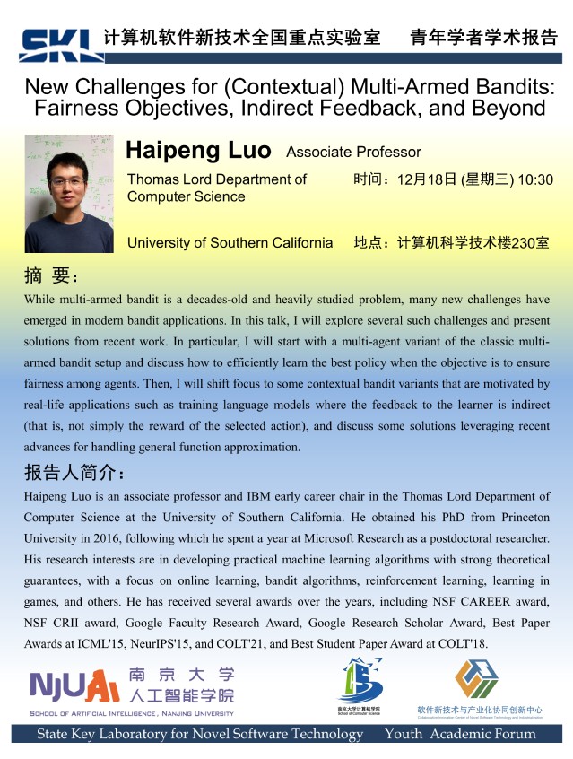 2024年12月18日 “软件新技术讲坛” 学术报告 - Haipeng Luo Associate Professor