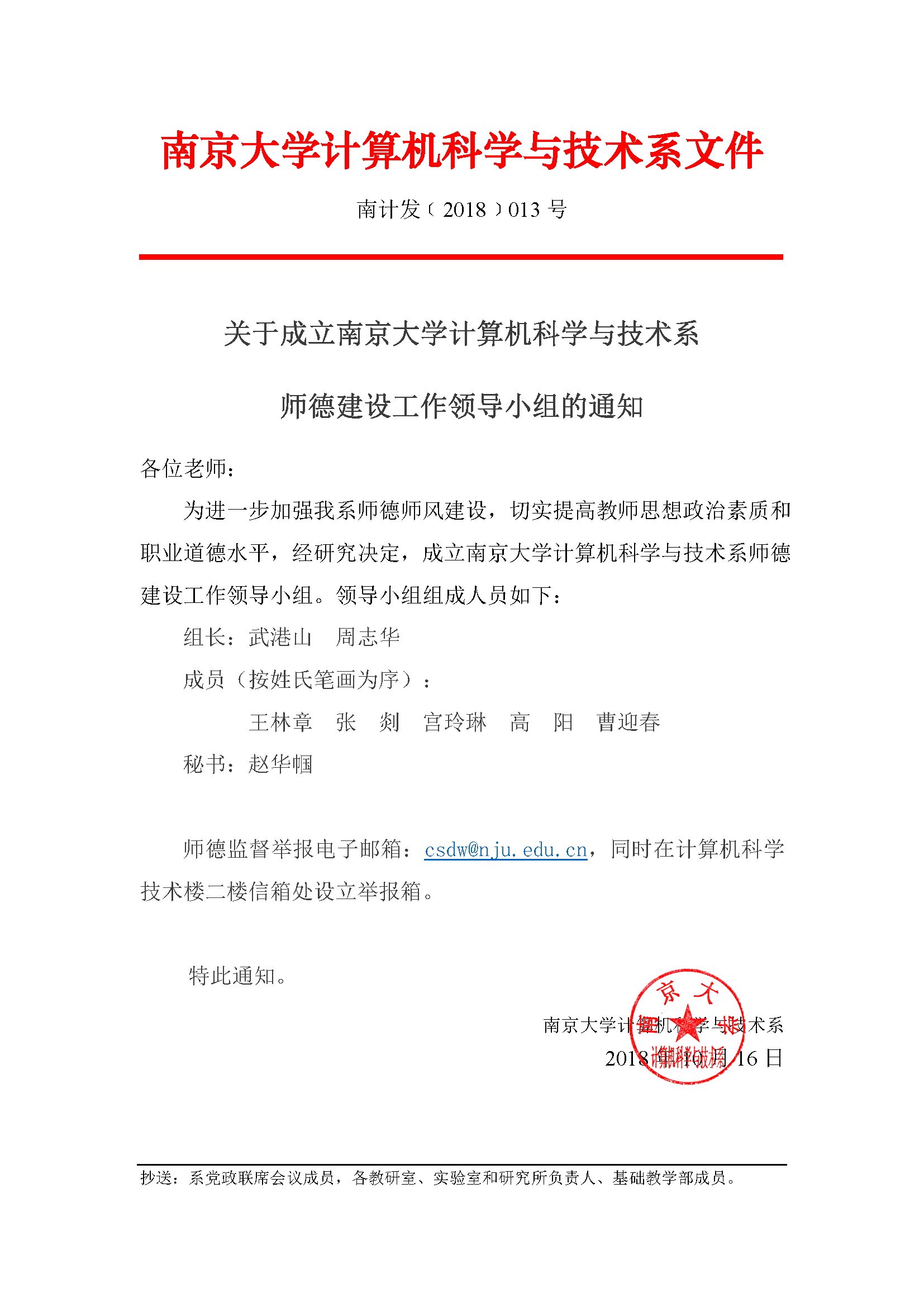 关于成立 BETWAY必威计算机科学与技术系 师德建设工作领导小组的通知