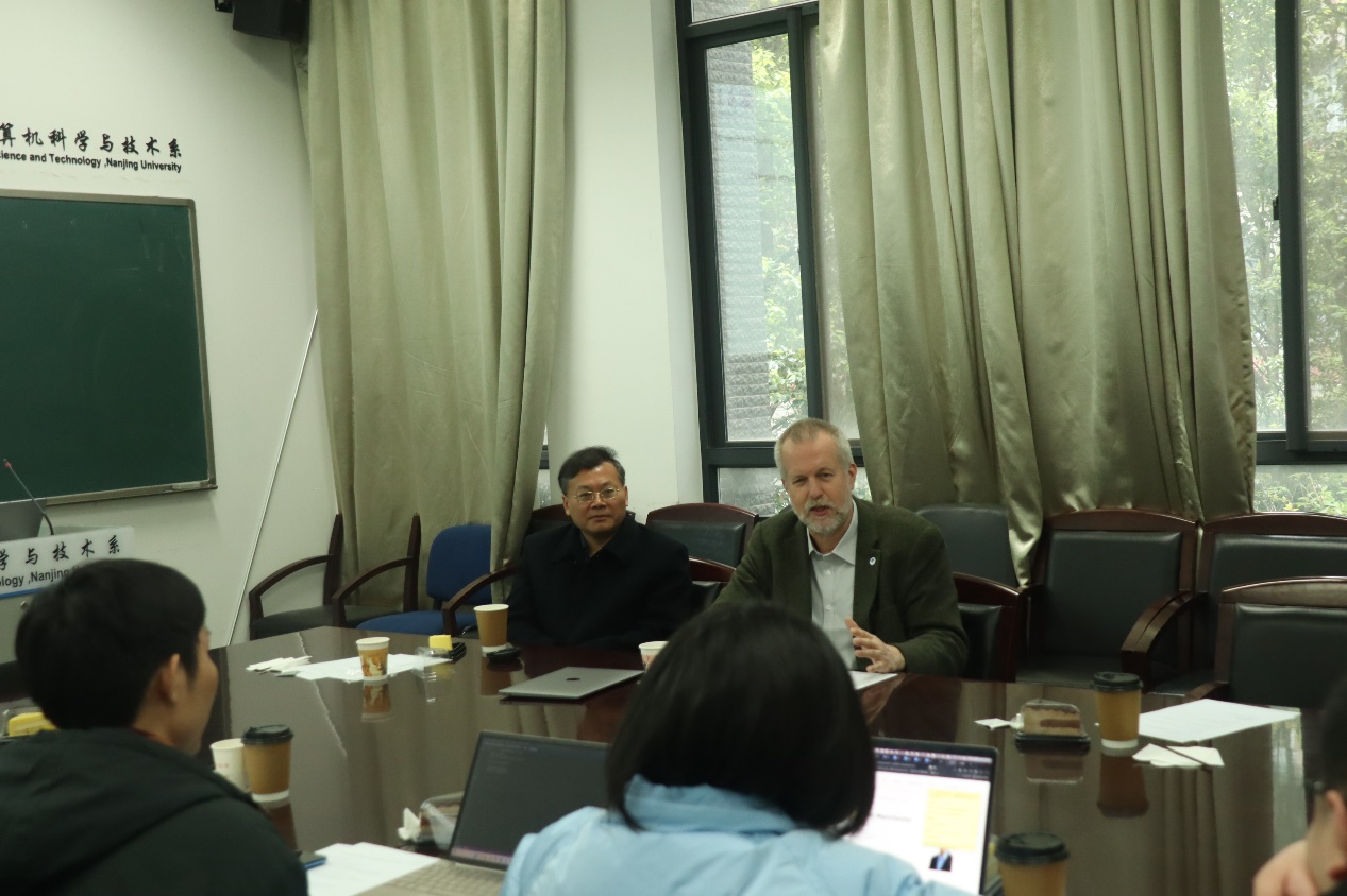 在参观计算机系大楼之际,Espen Aarseth教授详细了解了计算机系的发展历程以及重要科研成果。教授对公司计算机系的蓬勃发展和所取得的科研成果表示赞赏。