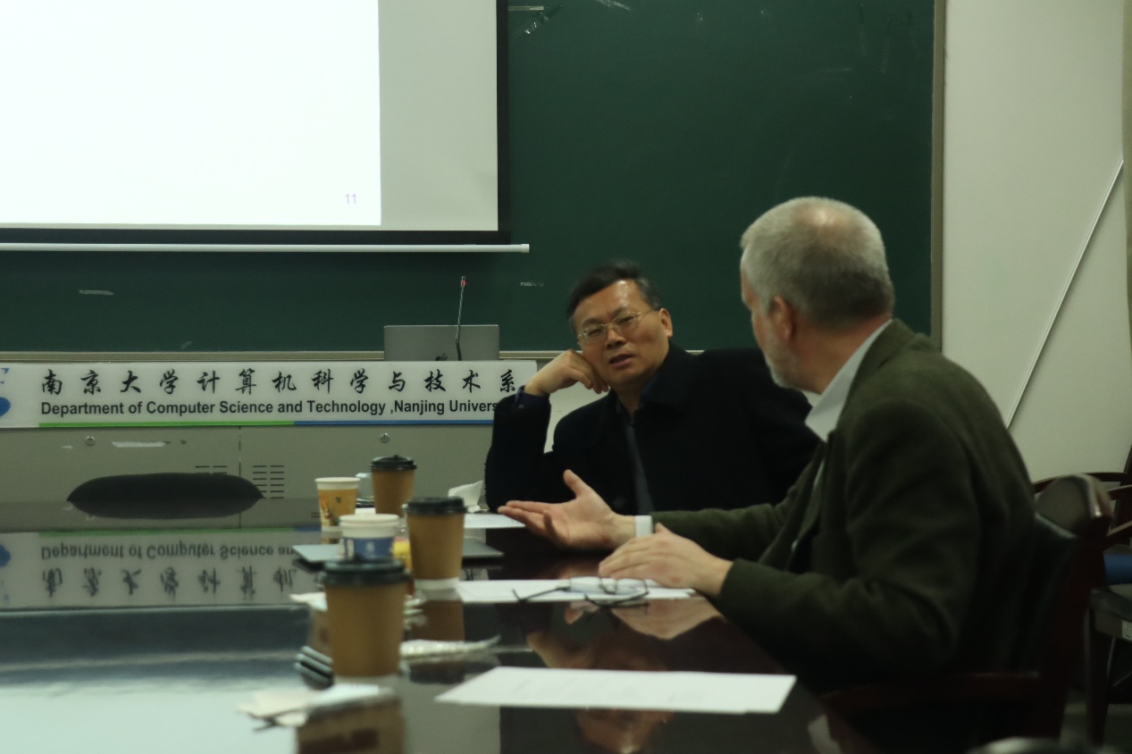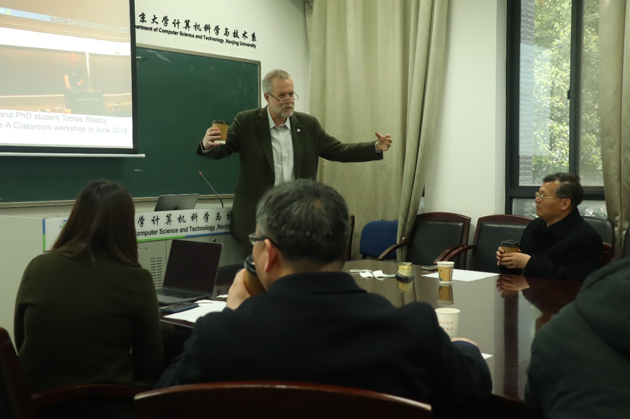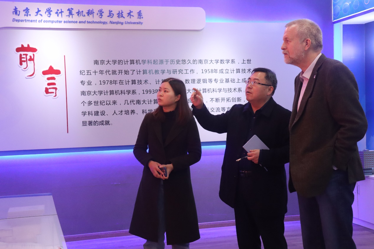 在参观计算机系大楼之际,Espen Aarseth教授详细了解了计算机系的发展历程以及重要科研成果。教授对公司计算机系的蓬勃发展和所取得的科研成果表示赞赏。