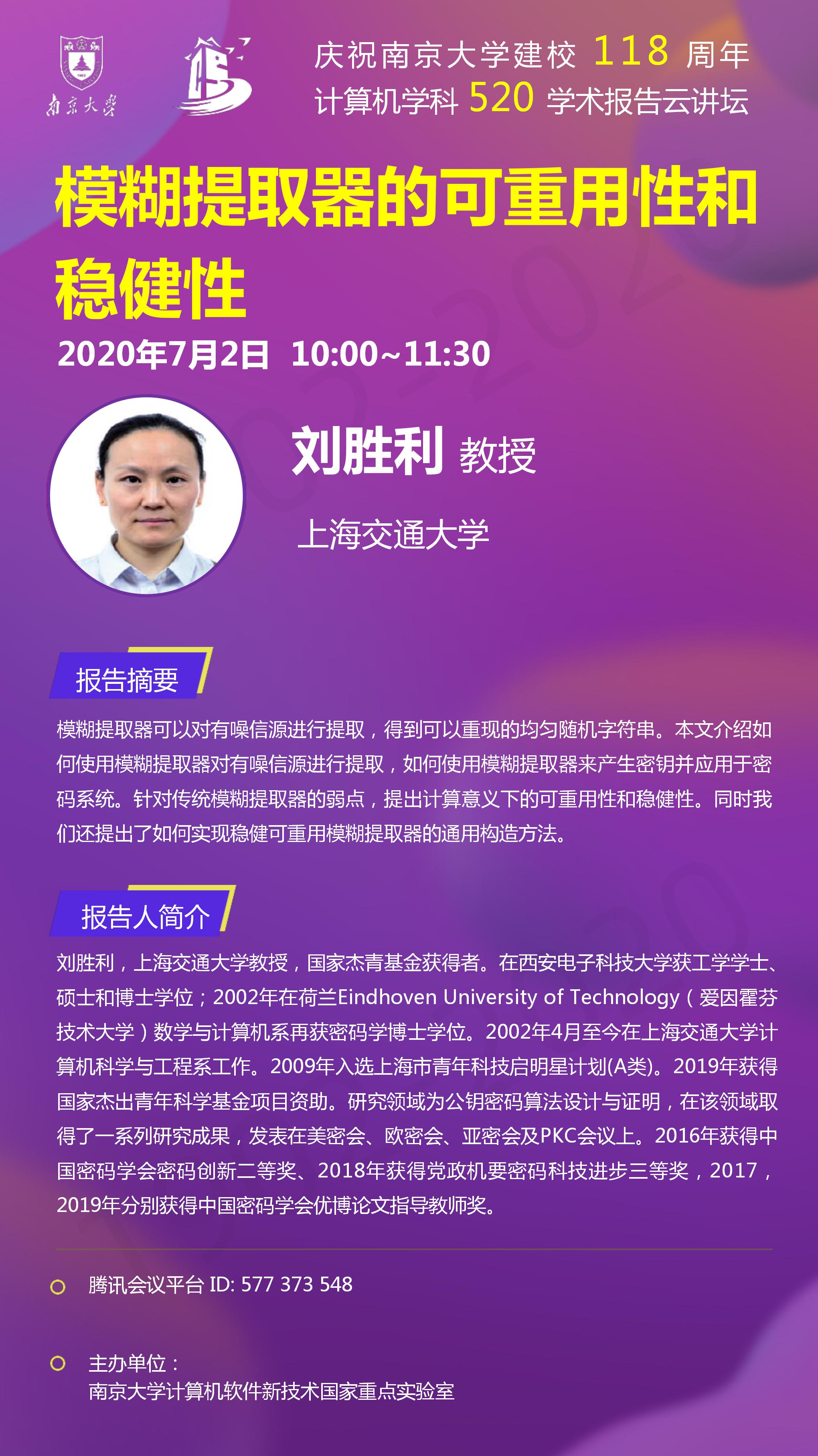 庆祝BETWAY必威建校118周年 计算机学科520学术报告云讲坛- 刘胜利 教授