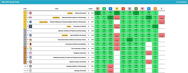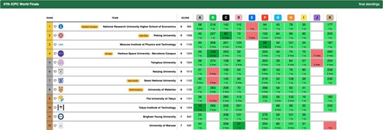 以下是46届和第47届比赛的部分榜单(完整榜单在https://scoreboard.icpc.global/46/和https://scoreboard.icpc.global/47/)