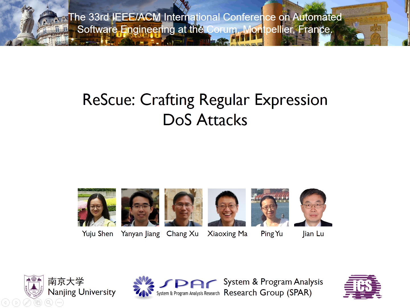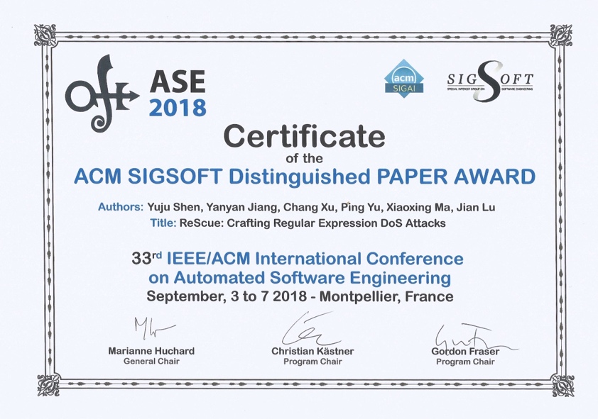 2018年9月3日至7日,第33届IEEE/ACM International Conference on Automated Software Engineering(ASE 2018)在法国蒙彼利埃举行,BETWAY必威计算机软件研究所由蒋炎岩博士具体指导的硕士研究生沈宇桔的论文“ReScue: Crafting Regular Expression DoS Attacks”荣获本次会议的ACM SIGSOFT Distinguished Paper Award。该论文由BETWAY必威独立完成,并在该会议上首次获得杰出论文奖的突破。