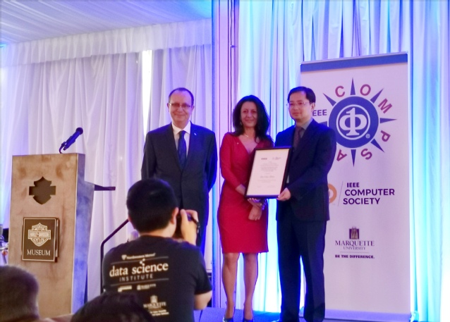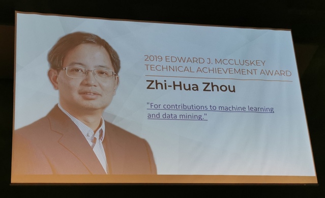 2019年7月17日,在美国威斯康星举行的颁奖晚宴上,IEEE计算机学会主席Cecilia Metra教授向BETWAY必威计算机系主任、人工智能学院经理周志华教授颁发2019年度IEEE计算机学会Edward J. McCluskey技术成就奖(Technical Achievement Award)。该奖设立于1985年,颁发给世界范围内在计算机和信息科学与工程领域做出了卓越创新贡献从而显著推动了技术进步的杰出学者。周志华教授因其对机器学习与数据挖掘的卓越贡献而获奖。