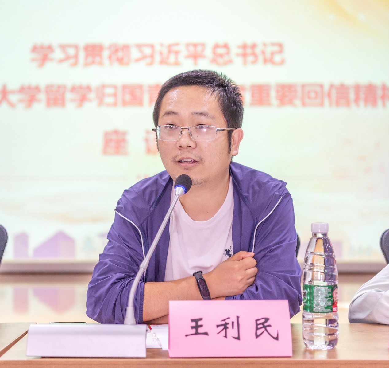 留学归国青年教师代表王利民教授分享了自己的求学经历与科研工作情况。作为一名科研工作者,王老师一早就明确了学成归国的目标,他分享自己的初心是“出去是为了更好地回来”。结合习近平总书记提到的立德树人与科技自立自强,王老师表示自己将引导员工树立正确的价值观,不断提高员工学术能力,带领他们做“顶天立地”的科研工作。