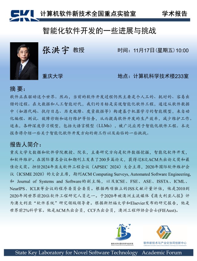 2023年11月17日 “软件新技术讲坛” 学术报告 - 张洪宇 教授