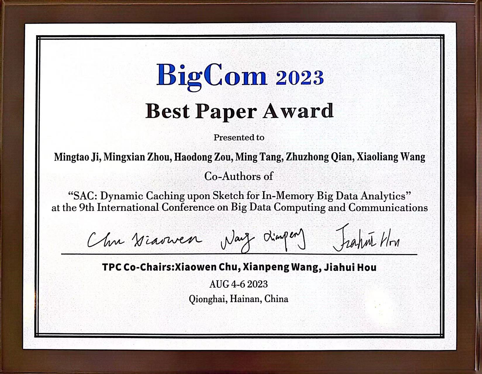 - Mingtao Ji, Mingxian Zhou, Haodong Zou, Ming Tang, Zhuzhong Qian, Xiaoliang Wang, SAC: Dynamic Caching upon Sketch for In-Memory Big Data Analytics, BigCom, 2023 (Best Paper Award)