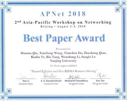 - Zhaochen Zhang, Feiyang Xue, Keqiang He, Zhimeng Yin, Gianni Antichi, Jiaqi Gao, Yizhi Wang, Rui Ning, Haixin Nan, Xu Zhang, Peirui Cao, Xiaoliang Wang, Wanchun Dou, Guihai Chen, Chen Tian.Enabling Virtual Priority in Data Center Congestion Control. EuroSys 2025, (Best Student Paper)